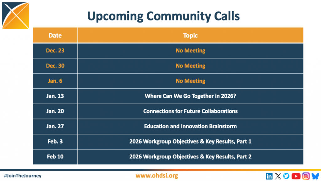 Everybody is invited to the weekly OHDSI community call, which takes place each Tuesday at 11 am ET. These calls are meant to inform and engage our community through a variety of call formats, including community presentations, workgroup updates, breakout sessions, publication announcements, newcomer-focused sessions, and more. The upcoming schedule is available to the right.