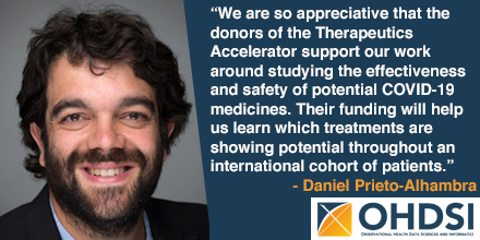 “We are so appreciative that the donors of the Therapeutics Accelerator support our work around studying the effectiveness and safety of potential COVID-19 medicines,” says Daniel Prieto-Alhambra, Professor of Pharmaco- and Device Epidemiology at Oxford and co-PI on the project. “Their funding will help us learn which treatments are showing potential throughout an international cohort of patients. Every ounce of knowledge is a building block that will eventually lead us out of this global crisis.”